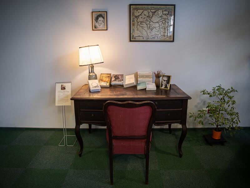 Displayed next to the desk, chair and lamp, there are reproductions of a fragment of a painting by Jacob Jordaens (1621) from his study and an English map of Poland from 1622 by John Speed. The memorabilia were donated to the library as a temporary deposit by Dr Tomasz Markiewka, a researcher of the writer’s oeuvre and employee of the Faculty of Humanities and Social Sciences at the ATH.