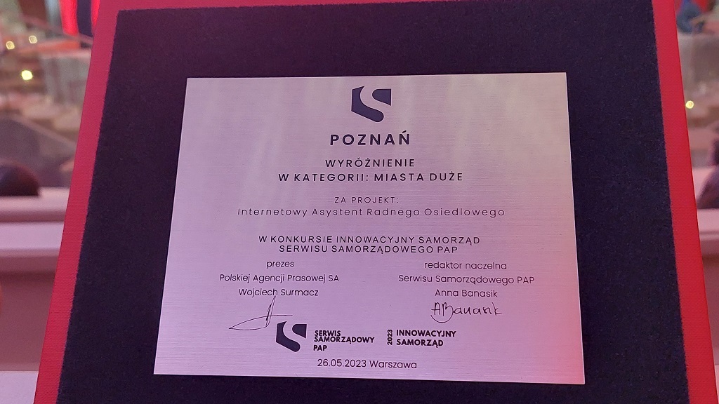 El Asistente en Línea del Concejal de Distrito (IARO), una herramienta implementada por la Oficina de Digitalización y Ciberseguridad del Ayuntamiento de Poznań en cooperación con el Centro de Supercomputación y Redes de Poznań (PSNC), ganó una distinción en el concurso «Gobierno Local Innovador».