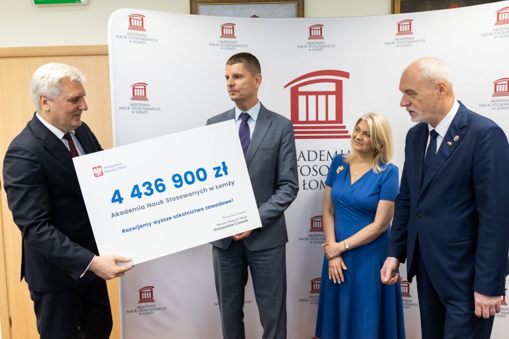 El viceministro de Educación y Ciencia, Dariusz Piontkowski, entregó a las autoridades de la Academia de Ciencias Aplicadas en Łomża un cheque simbólico por casi 4,5 millones de zlotys. Estos son los fondos que la institución recibirá debido al aumento de la subvención para 2022. Un total de 136 millones de zlotys se destinará a escuelas de formación profesional en toda Polonia.