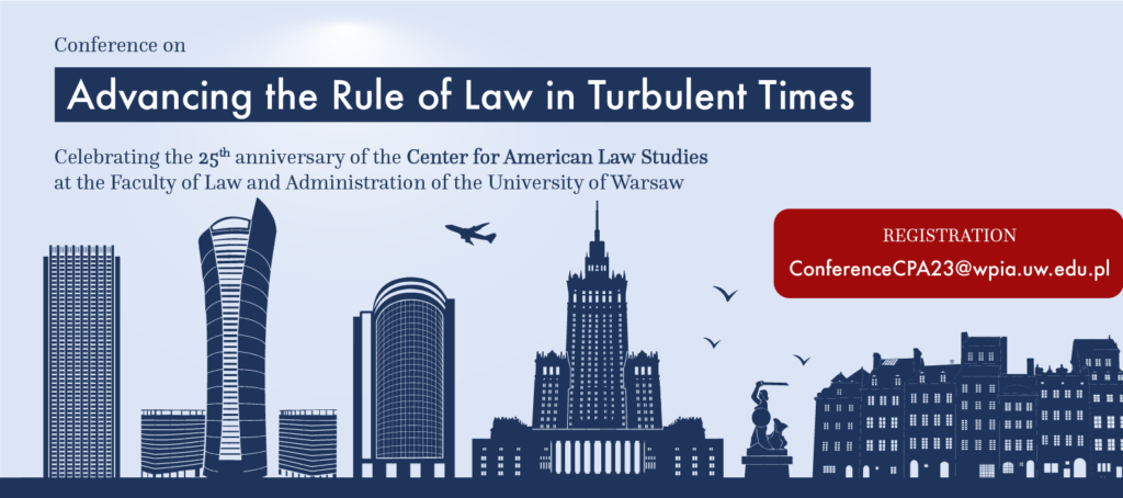 El 15 de junio de 2023, el Centro de Derecho Estadounidense de la Universidad de Varsovia (UW) acogerá una conferencia sobre el desarrollo del estado de derecho en tiempos turbulentos.