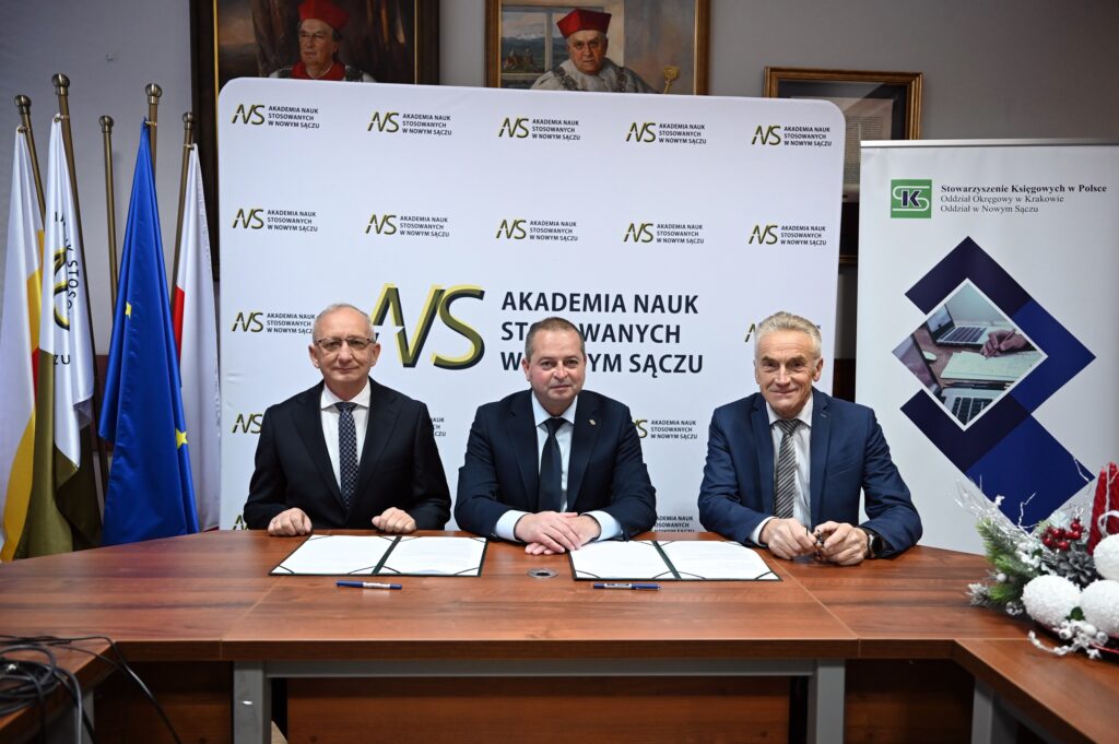 L’Association des Comptables en Pologne (SKwP) a rejoint le cercle des écoles, institutions et entreprises coopérant avec l’ANS de Nowy Sącz. L’accord a été signé par le docteur d’État Mariusz Cygnar, professeur à l’ANS, recteur de l’ANS de Nowy Sącz, Łukasz Górka, président du conseil d’administration de la section régionale de SKwP à Cracovie, et Włodzimierz Lurka – directeur du bureau du conseil d’administration de la section régionale de SKwP à Cracovie.