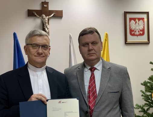 Le Dr Piotr Jednaszewski est membre du Conseil de l’Université Cardinal Stefan Wyszyński (UKSW) qui vit en Écosse, a remis au Révérend Prof. Ryszard Czekalski une lettre d’intention sur la coopération internationale dans le cadre du programme Erasmus+. Le signataire de la lettre est le professeur Philippe Froute, doyen de l’École Internationale EAI, Université Paris-Est Créteil Val de Marne.