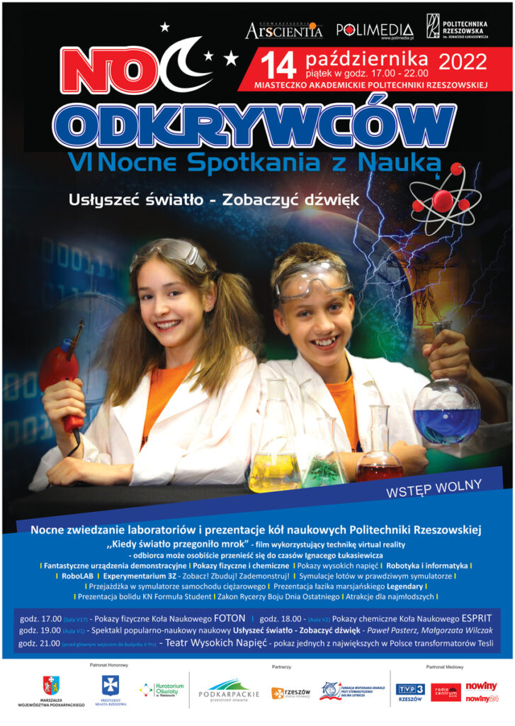 La Polytechnique de Rzeszów et la société Polimedia invitent à la « NUIT DES DECOUVERTES – La VIe Nuit des Rencontres avec la Science » le 14 octobre 2022. L’événement s’adresse aux enfants, aux écoliers, aux étudiants et aux habitants de Rzeszów et de la région des Basses-Carpates – aux amateurs de connaissances et aux personnes « curieuses du monde » et des phénomènes qui s’y produisent.