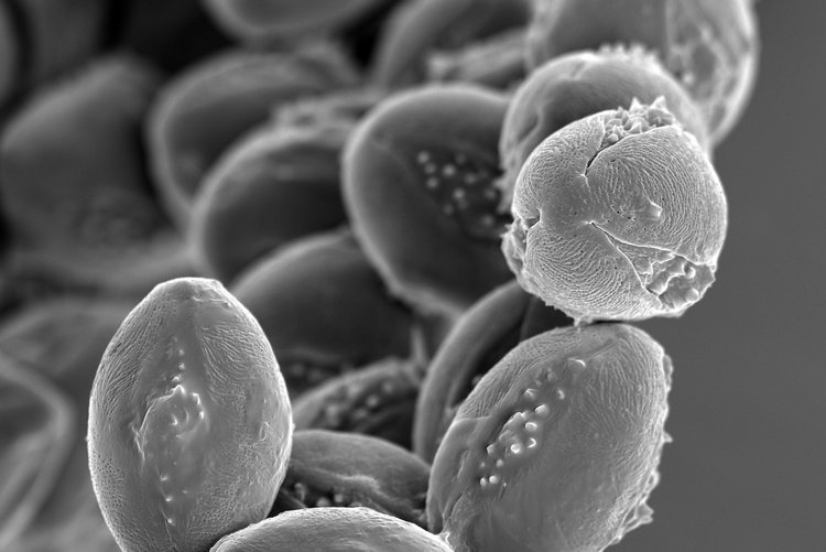 La photo d’un scientifique du Centre pour les matériaux et technologies avancés CEZAMAT de la Polytechnique de Varsovie montre du pollen de châtaigne collecté en mai 2022 à Varsovie. Les pointes qui dépassent de la surface des grains de pollen aident ces derniers à se fixer aux insectes, qui les transportent sans le savoir entre les arbres.