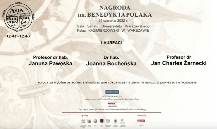 Les prix Benedykt Polak ont été remis à l’Université de Varsovie (UW). Cette distinction est décernée aux citoyens polonais pour « des réalisations exceptionnelles en matière d’exploration sur terre, en mer, dans les airs et dans l’espace » et aux étrangers pour « la promotion des thèmes de recherche polonais et la coopération avec nos scientifiques ».