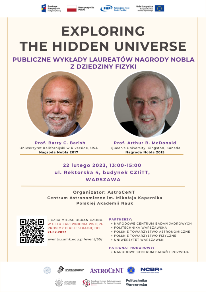 Le 22 février, les lauréats du prix Nobel de physique, les professeurs Barry C. Barish et Arthur B. McDonald, donneront des conférences intitulées « L’exploration de l’univers caché ». L’événement aura lieu au Centre de Gestion de l’Innovation et de Transfert de tTechnologie de la Polytechnique de Varsovie.