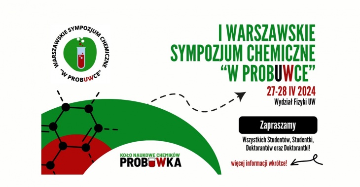 Koło Naukowe Chemików „ProbUWka” działające na Uniwersytecie Warszawskim (UW) zaprasza wszystkich studentów i studentki oraz doktorantów i doktorantki nauk chemicznych na I Warszawskie Sympozjum Chemiczne ,,w ProbUWce”, które odbędzie się w dniach 27-28 kwietnia 2024 r. na Wydziale Fizyki UW.