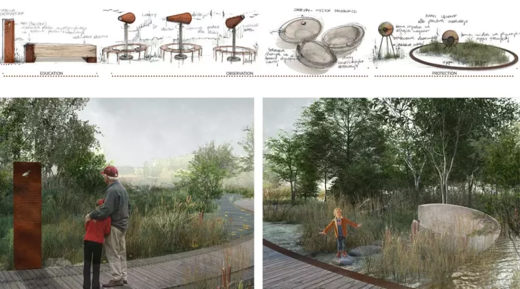 Dla autorki projektu ważne było wykorzystanie potencjału hydrologicznego tego miejsca i przekształcenie terenu w spójny system retencyjny z zastosowaniem wielu rozwiązań, które wspierają lokalną retencję.