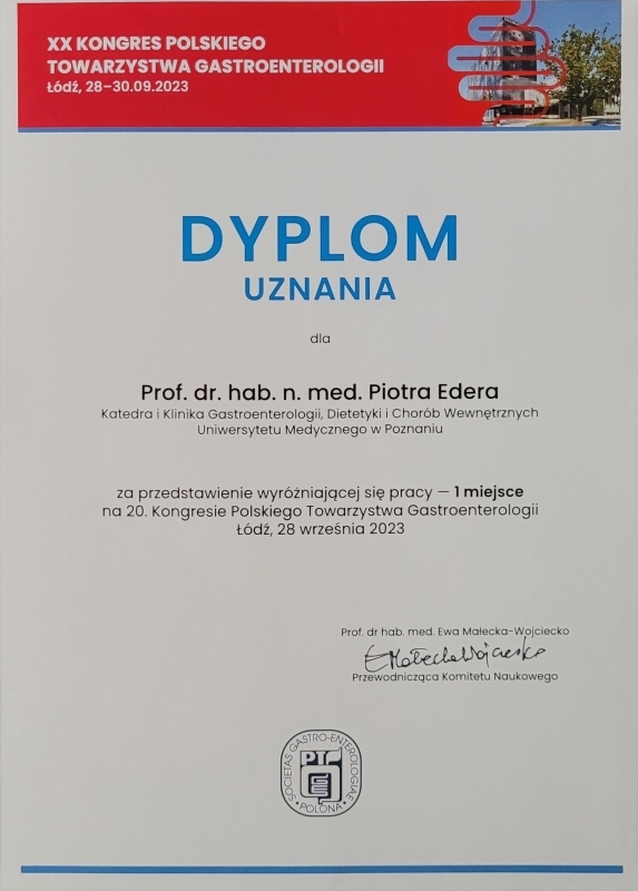 Prof. dr hab. Piotr Eder, Zastępca Kanclerza Kolegium Nauk Medycznych Uniwersytetu Medycznego w Poznaniu i pracownik Katedry i Kliniki Gastroenterologii, Dietetyki i Chorób Wewnętrznych zdobył nagrodę za najlepszą pracę naukową zgłoszoną na kongres Polskiego Towarzystwa Gastroenterologii.