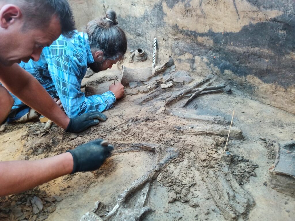 Wewnątrz obiektu, na głębokości blisko dwóch metrów, natrafiono na szkielety dwóch osób, ułożonych w pozycji skurczonej. Zmarłym towarzyszyły rożnego rodzaju dary grobowe, m.in. naczynia ceramiczne, siekierki, dłuto kościane i inne przedmioty. Pozyskane materiały archeologiczne i bioarcheologiczne poddane zostaną specjalistycznym analizom laboratoryjnym, a wyniki tych prac będą w przyszłości opublikowane i szeroko udostępnione.