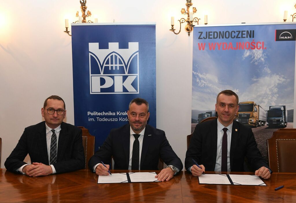 Porozumienie o współpracy w zakresie wspólnego prowadzenia badań naukowych i analiz technologicznych, wzajemnych szkoleń dla pracowników, stażów i praktyk dla studentów oraz innych inicjatyw dydaktyczno-badawczych podpisali prof. Andrzej Szarata, rektor Politechniki Krakowskiej (PK) oraz dr Richard Slovák, prezes zarządu MAN Trucks i Bogdan Lis, członek zarządu spółki ds. personalnych.