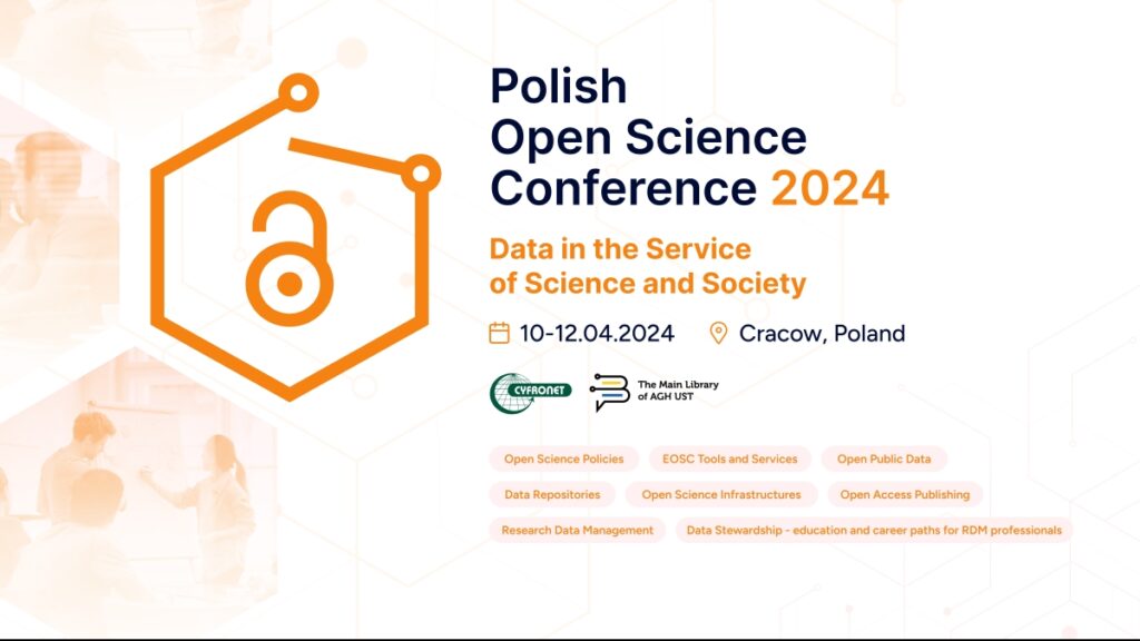 Akademickie Centrum Komputerowe CYFRONET Akademii Górniczo-Hutniczej (AGH) w Krakowie oraz Biblioteka Główna AGH organizują w dniach 10–12 kwietnia 2024 r. Polską Konferencję Open Science 2024, która będzie poświęcona zagadnieniom związanym z różnymi aspektami Otwartej Nauki.