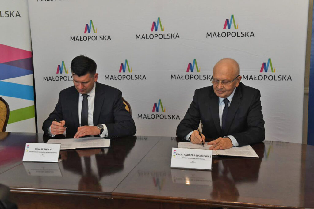 Wicemarszałek Województwa Małopolskiego Łukasz Smółka oraz rektor Politechniki Krakowskiej (PK) prof. Andrzej Białkiewicz podpisali porozumienie o prowadzeniu wspólnych projektów inżynierskich, programów badawczych i dydaktycznych m.in. w zakresie infrastruktury komunikacyjnej Małopolski.