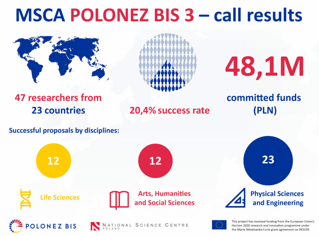 На только что завершившийся третий и последний конкурс программы POLONEZ BIS было подано в общей сложности 230 заявок. После формальной и содержательной оценки 47 проектов были допущены к финансированию. Среди них 23 проекта в области науки и техники, 12 — в области гуманитарных, социальных наук и искусства и 12 — в области наук о жизни.