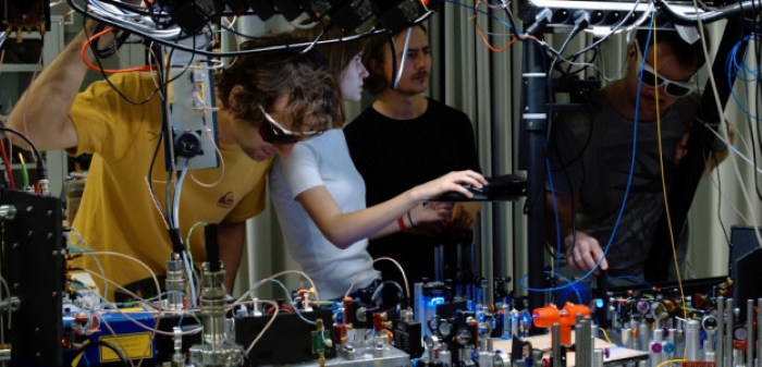 来自 QOT 光量子技术中心量子光学器件实验室的研究人员团队:来自华沙大学物理学院的 Michał Parniak 和 Mateusz Mazelanik 博士以及博士生 Sebastian Borówka 和硕士生 Uliana Pylypenko 构建了一种在单个微波和光学光子之间转换量子信息的装置。